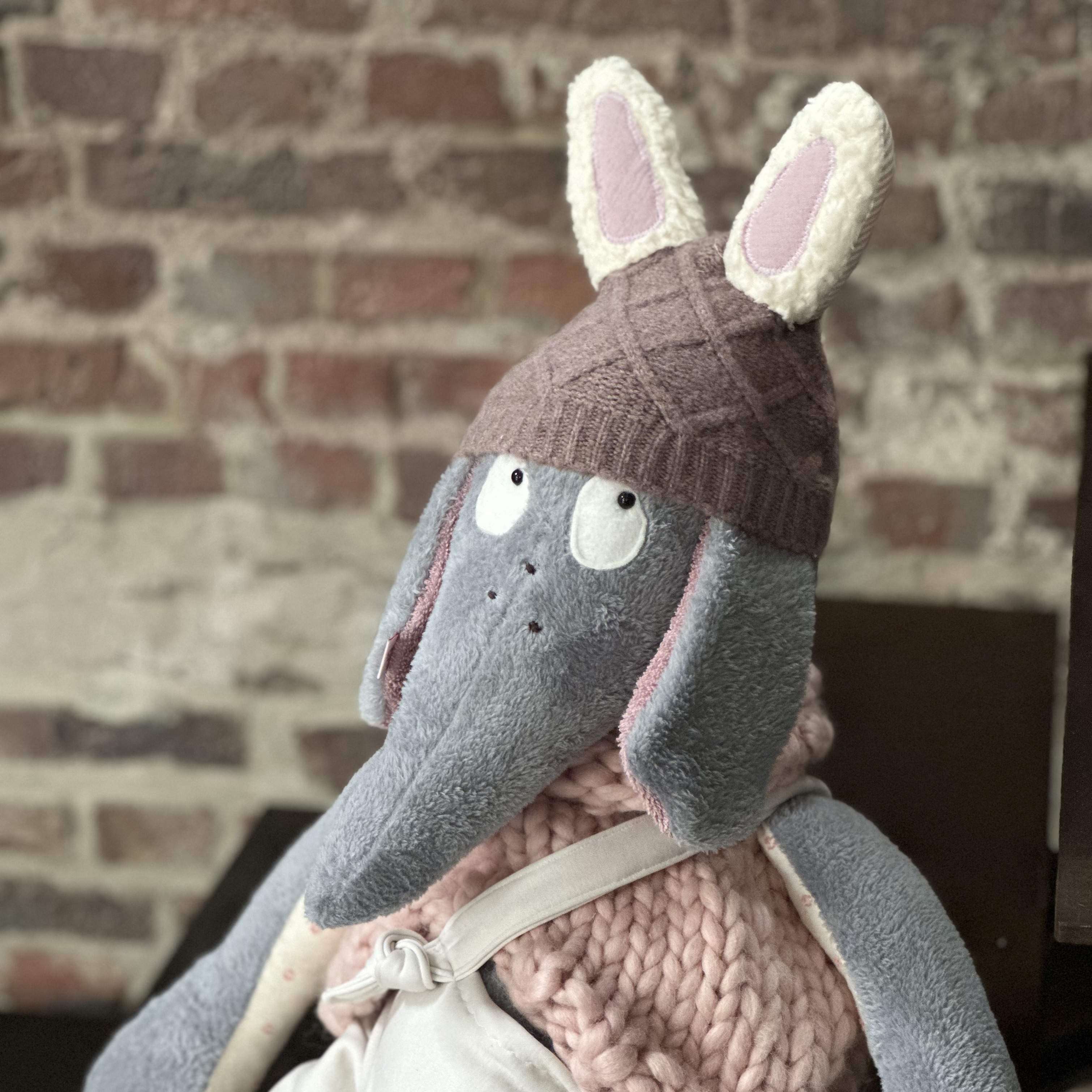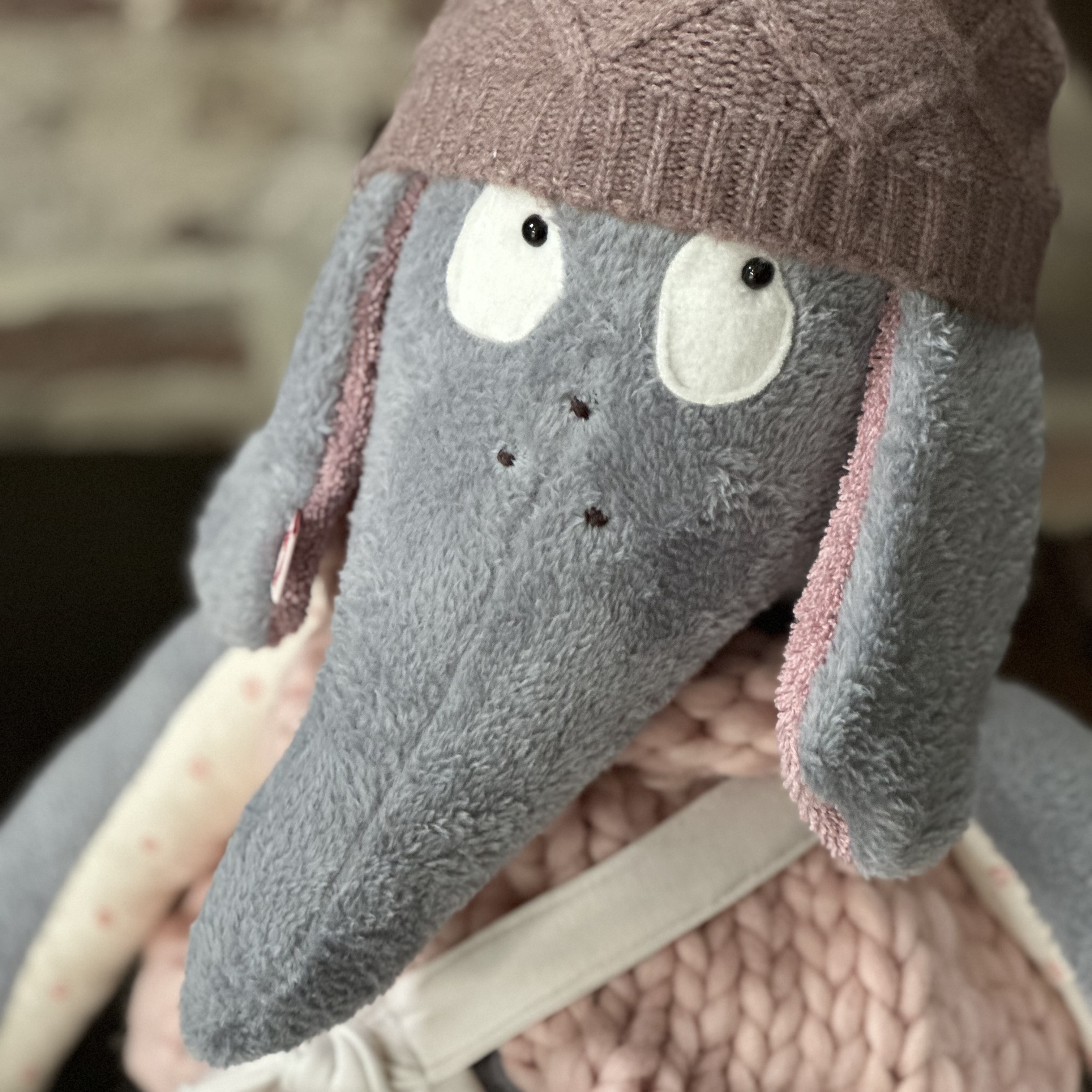 Die Elefanten Dame Lola ist mit ca.80cm ziemlich groß. Sie liebt Ostern und hat deshalb auch am liebsten ihre Hasenmütze an . Lolas Pullover ist handgestrickt und verträgt deshalb nur Handwäsche , ansonsten kann der komplette Elefant bei 30 Grad in die Waschmaschine und auch in den Trockner