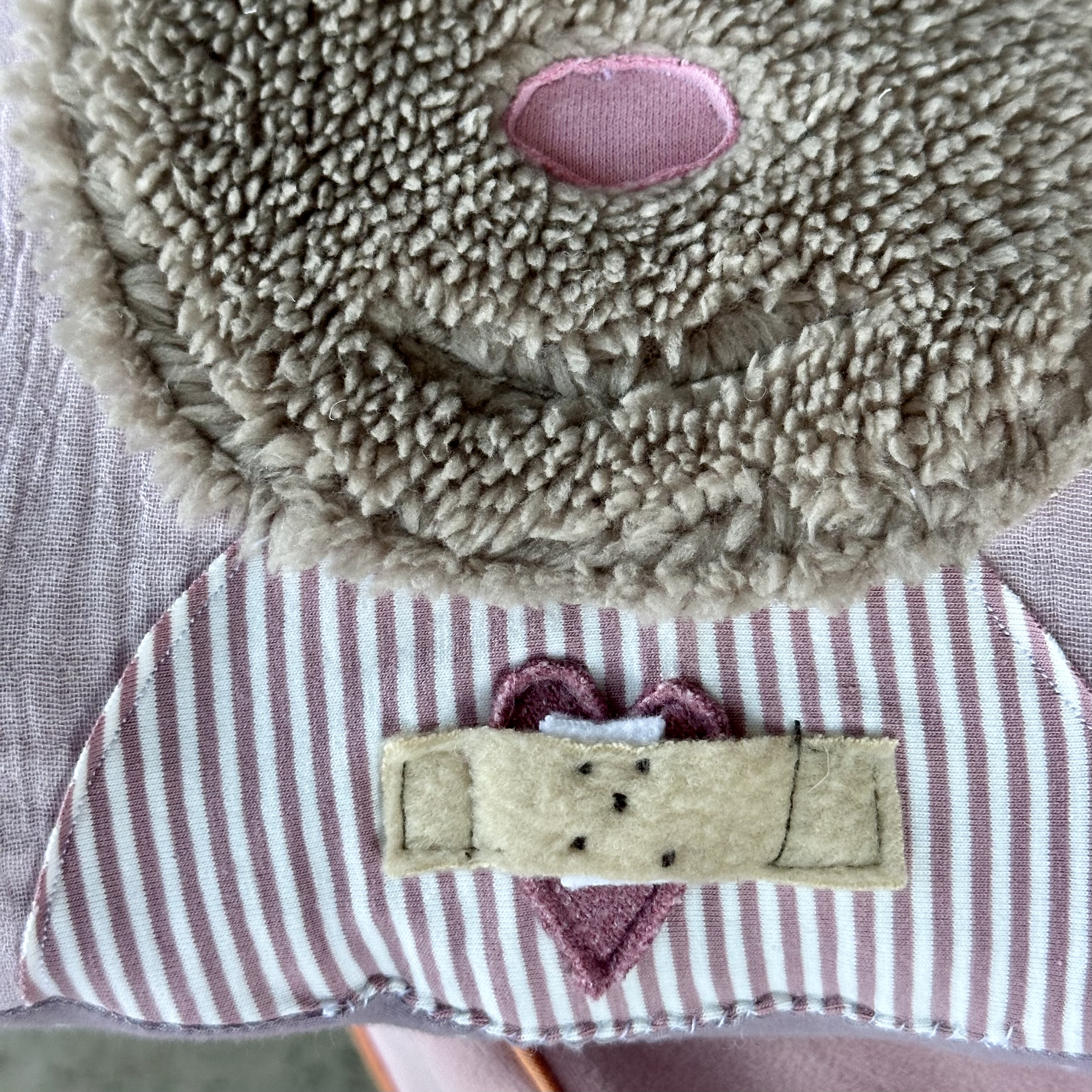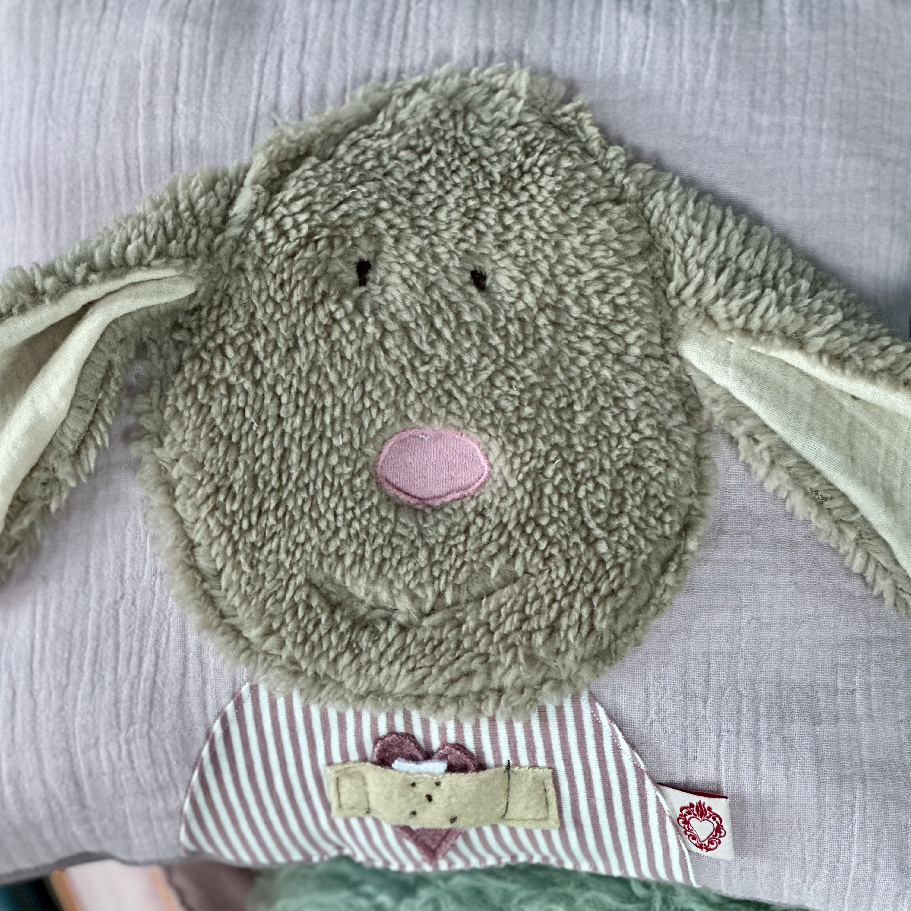 Das Trostkissen ist aus Blush farbigen Musselin genäht und hat ein Herz mit Pflaster als Trostzeichen auf dem Bauch .